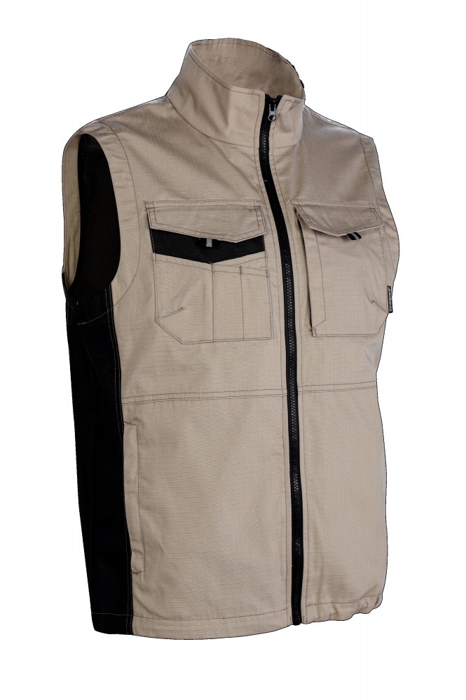 OROSI RIPSTOP MELLÉNY • 240 g/m2 vastag, 35% pamut + 65% poliészter kevertszálas ripstop (továbbszakadás biztos) alapanyag • kopásálló Oxford PES betétekkel megerősített erősebben igénybe vett területek: oldalrész, zsebeknél • egyenes szabású, modern formai kialakítású bikolor mellény, szerelők számára kifejlesztve • állig érő húzózár, magas gallérral, hálós béléssel • elasztikus zsinórral állítható derékrész • egy cipzáras felső zseb • egy tépőzáras fedett felső zseb + több rekesz • két tépőzáras fedett oldalzseb • bebújós függőleges nyílású oldalzseb
